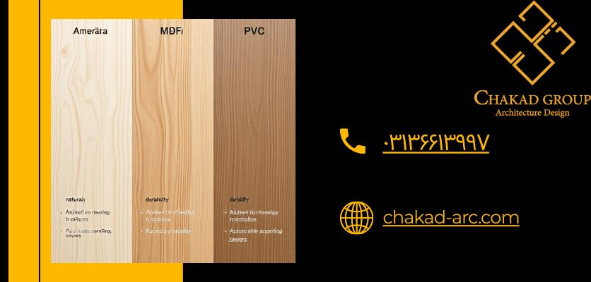چوب طبیعی، MDF و PVC از متریال های رایج هستند که بر اساس نیاز و شرایط محیطی انتخاب می شوند. - 3.عوامل تأثیرگذار بر هزینه لمبه کوبی چیست؟